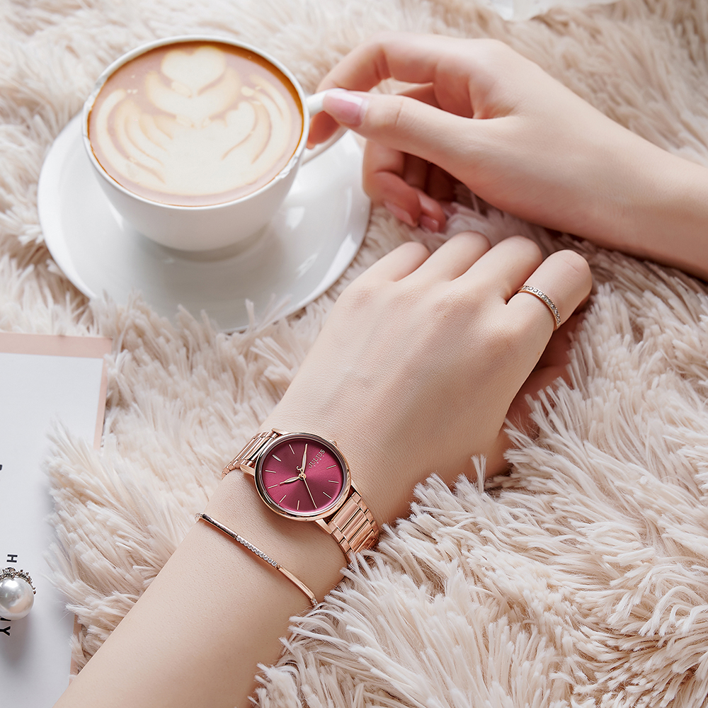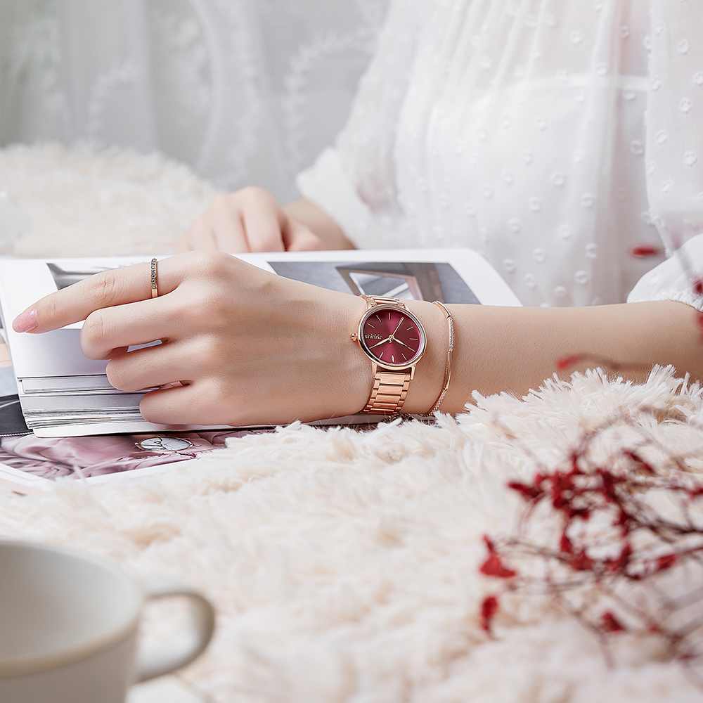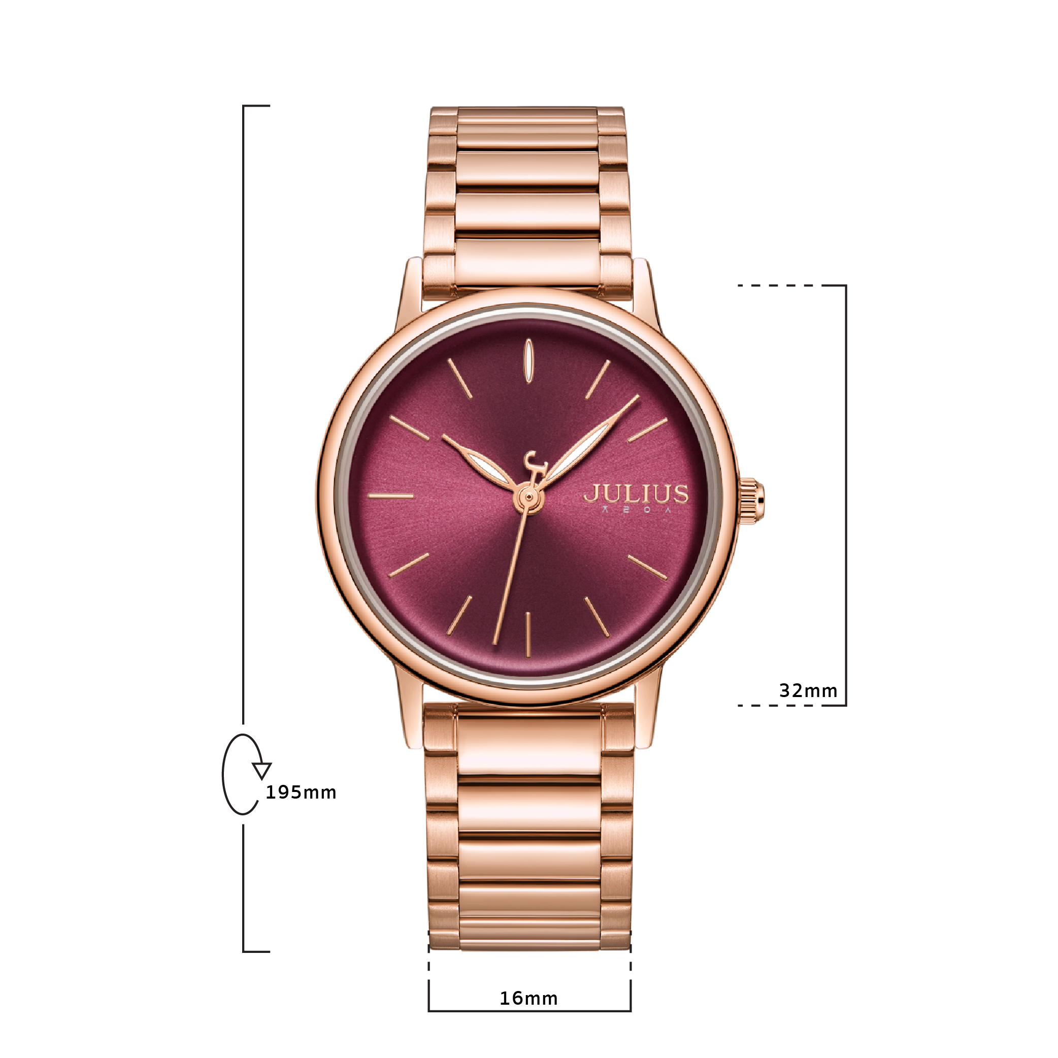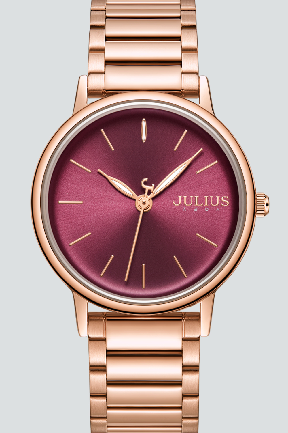 JULIUS นาฬิกาข้อมือผู้หญิง รุ่น JA-1262C หน้าปัดกลมสีแดง สายสแตนเลสสีโรสโกลด์ แบรนด์เกาหลีแท้ 100%