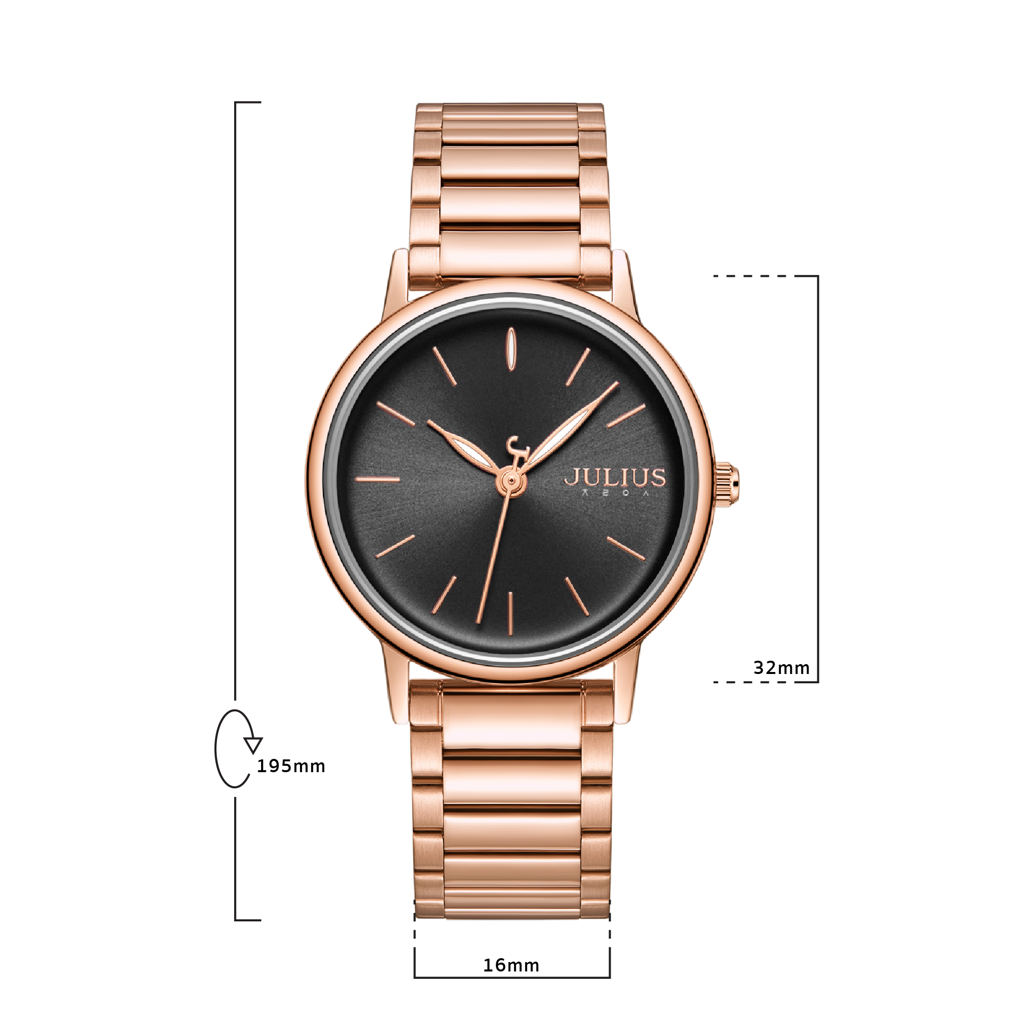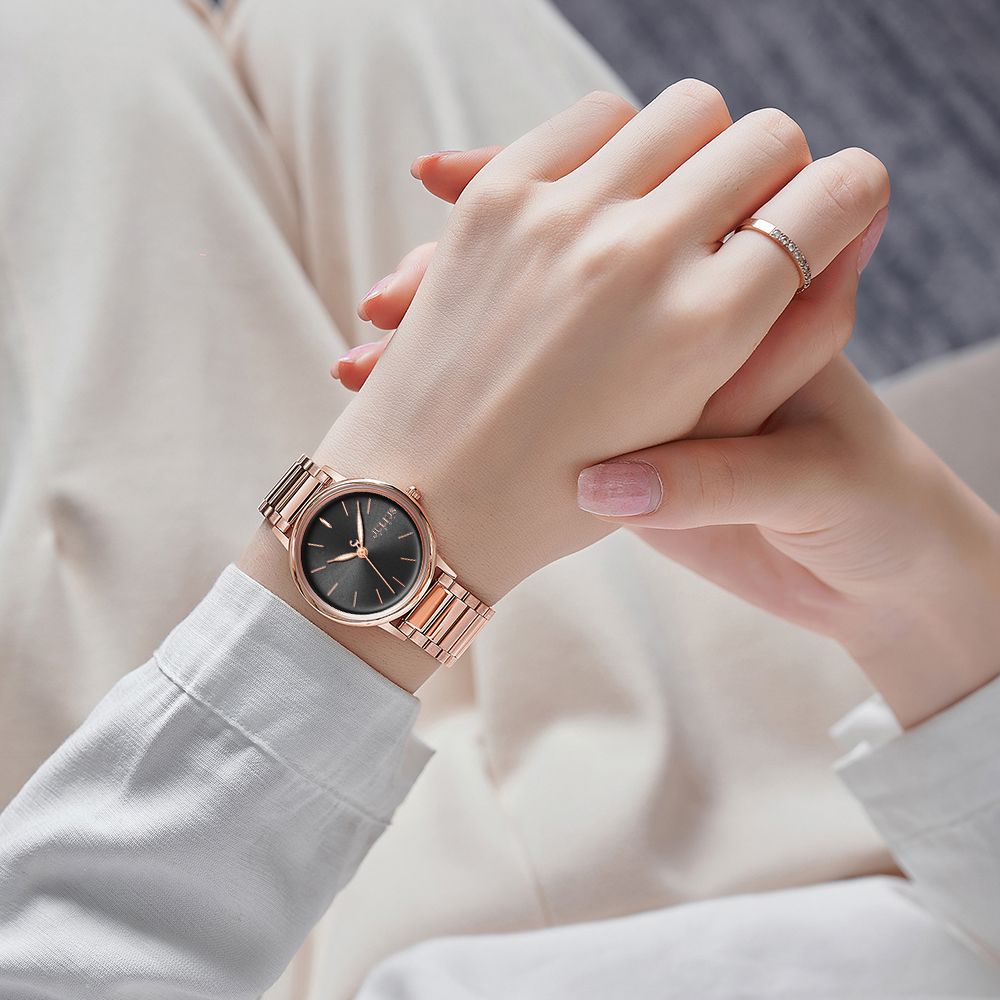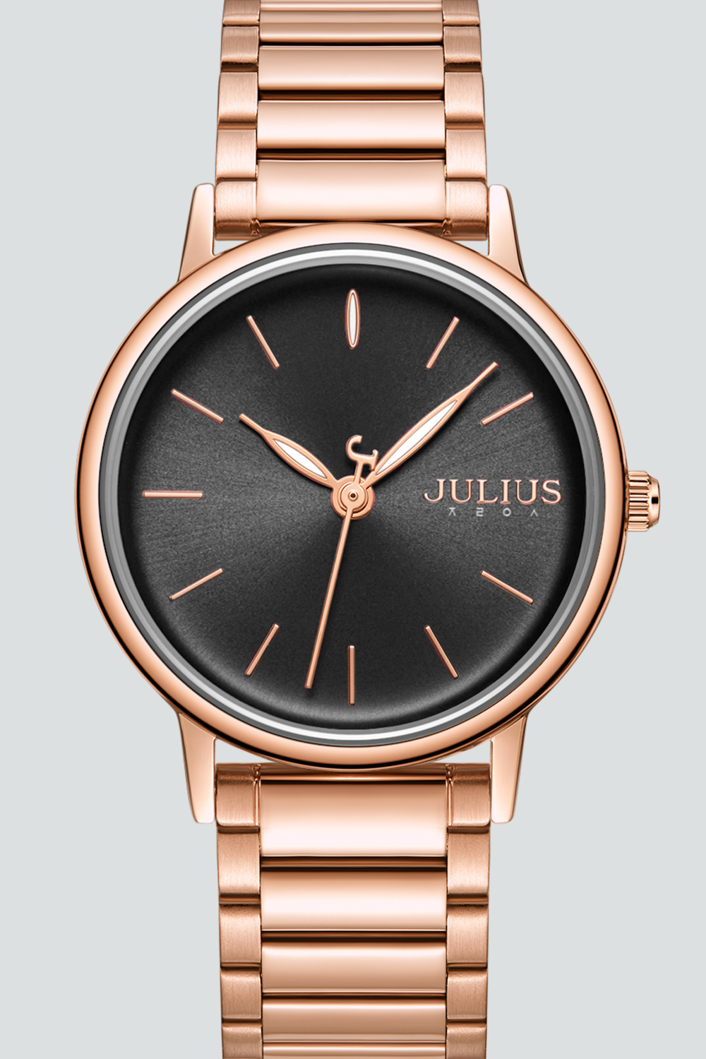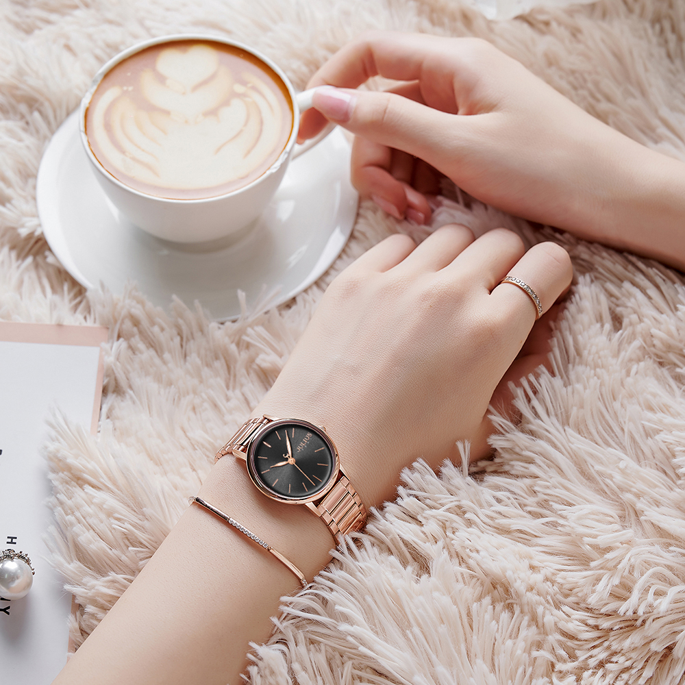 JULIUS นาฬิกาข้อมือผู้หญิง รุ่น JA-1262D หน้าปัดกลมสีดำ สายสแตนเลสสีโรสโกลด์ แบรนด์เกาหลีแท้ 100%