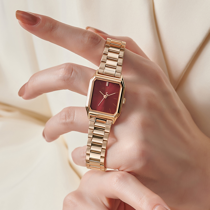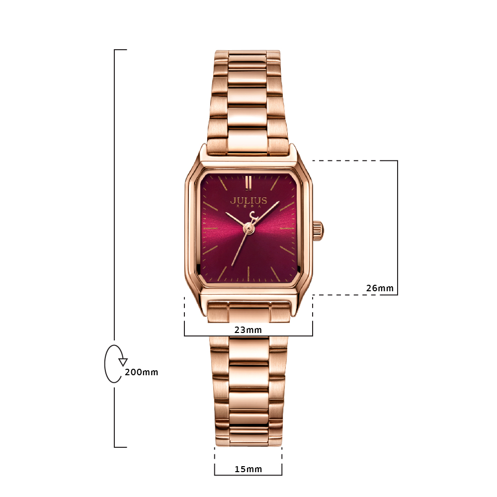 นาฬิกาข้อมือผู้หญิง JULIUS JA-1304 C สไตล์สาวชิค สุดเก๋ หน้าปัดเหลี่ยมสีแดง สายสแตนเลสแบบคลิปล็อคสีโรสโกลด์ แบรนด์เกาหลีแท้ 100%